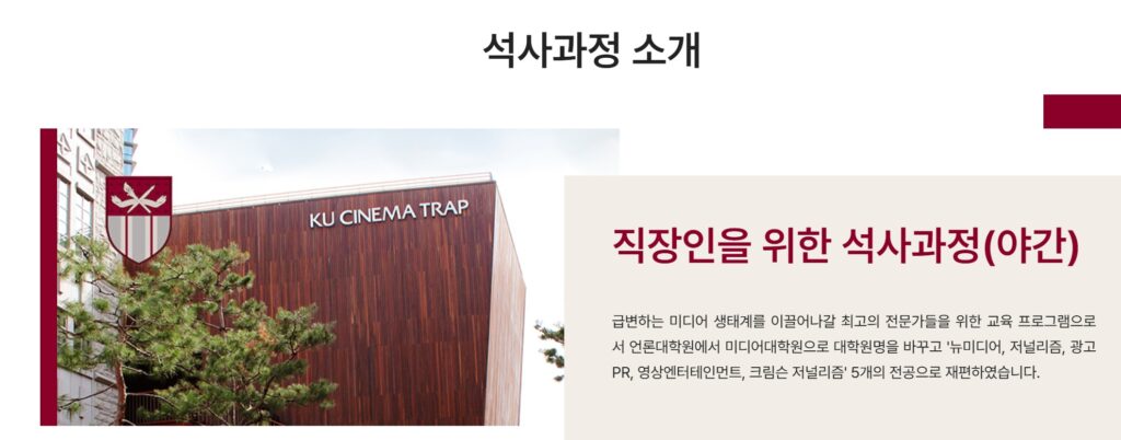 신문방송학과로 시작된 현재의 고려대학교 미디어 학부는 50년의 역사 동안 미디어 산업과 하계를 주도하는 많은 인재를 배출해 왔습니다. 미디어대학원은 예전의 언론대학원으로 직장인을 위한 야간 석사 과정을 제공하고 있습니다.